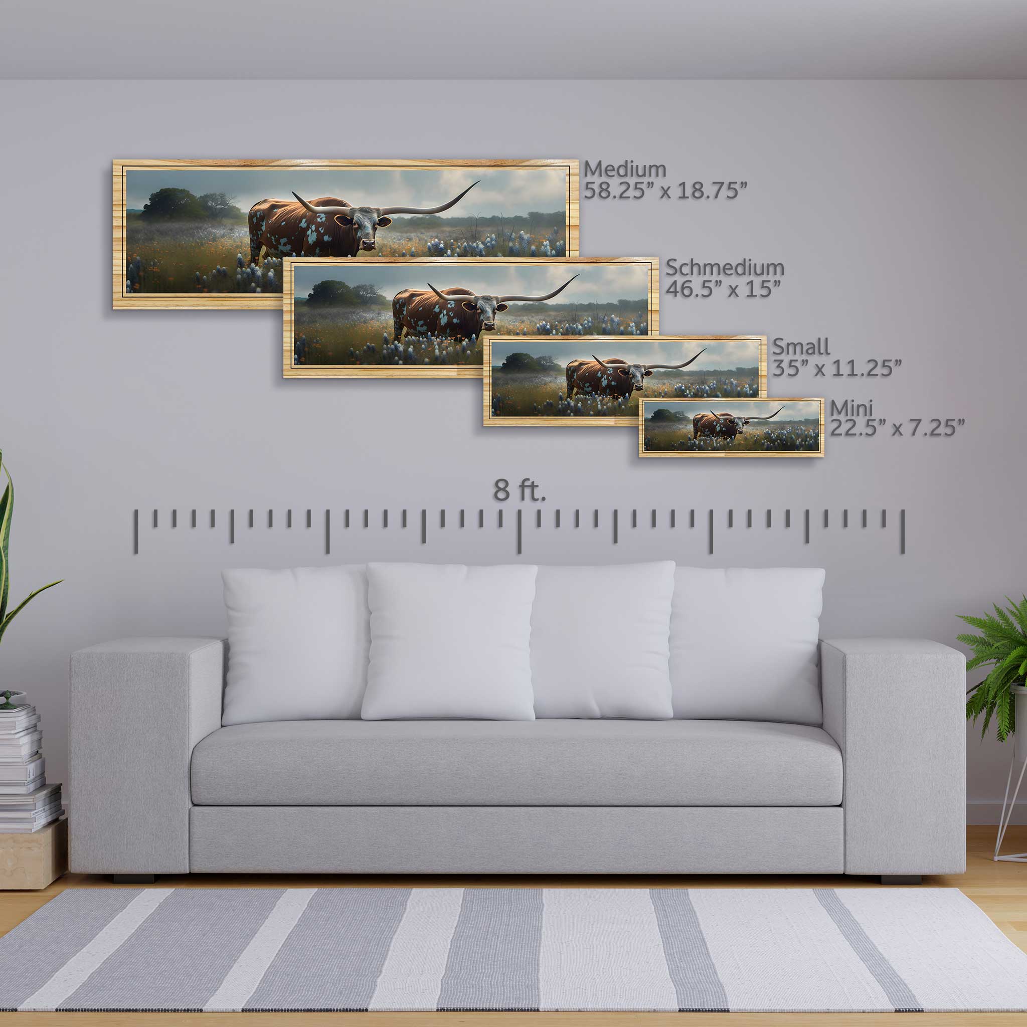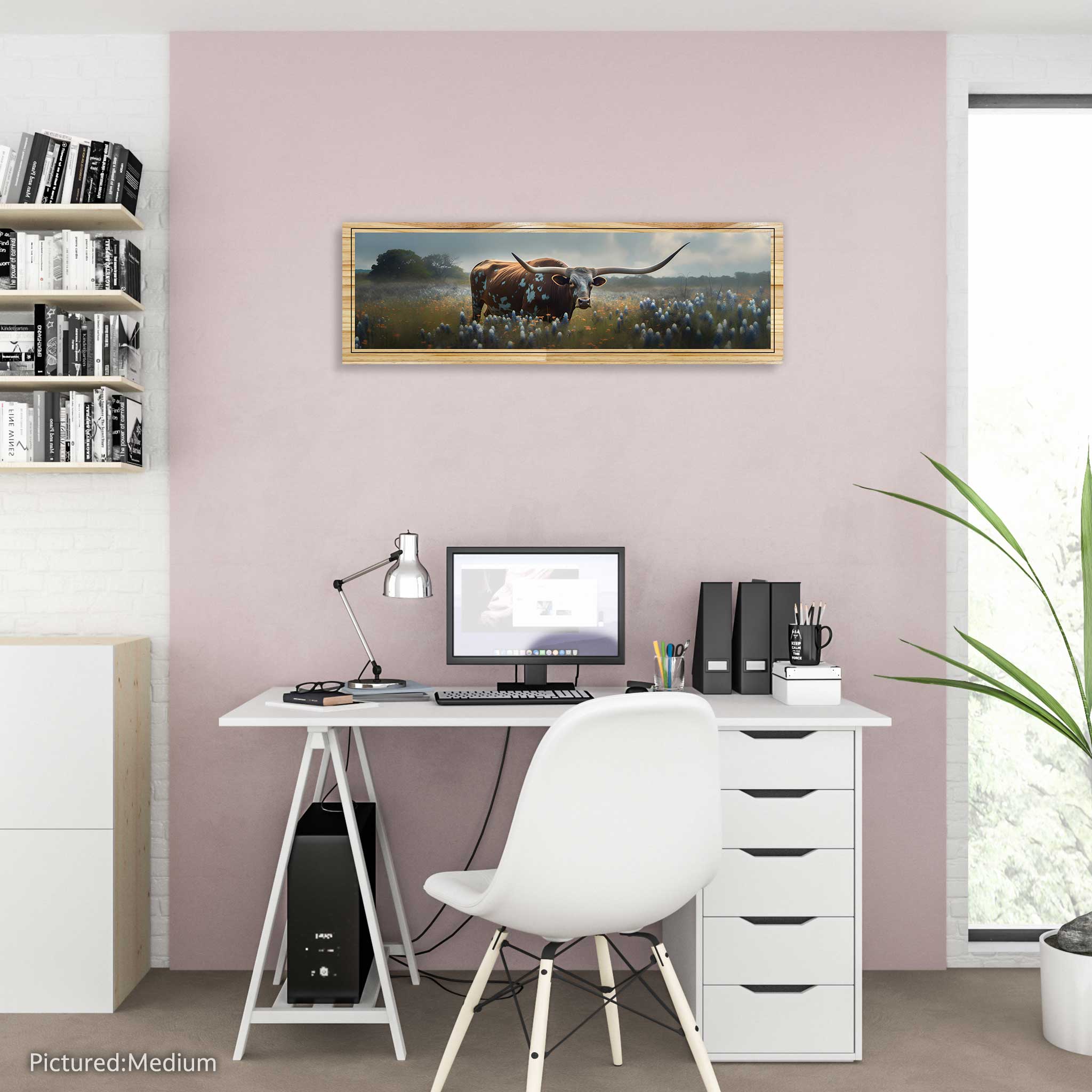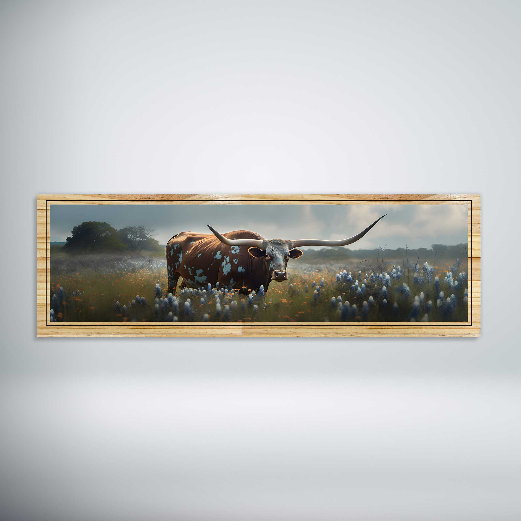 This print is presented on high-quality pine wood, amplifying the visual appeal with a rustic charm. The 'Longhorn in Blue Bonnets' print is more than just a piece of art - it's an invitation to bask in the allure of nature and the mystique of the wild. Add this piece to your collection to infuse your space with a touch of wilderness and tranquility.