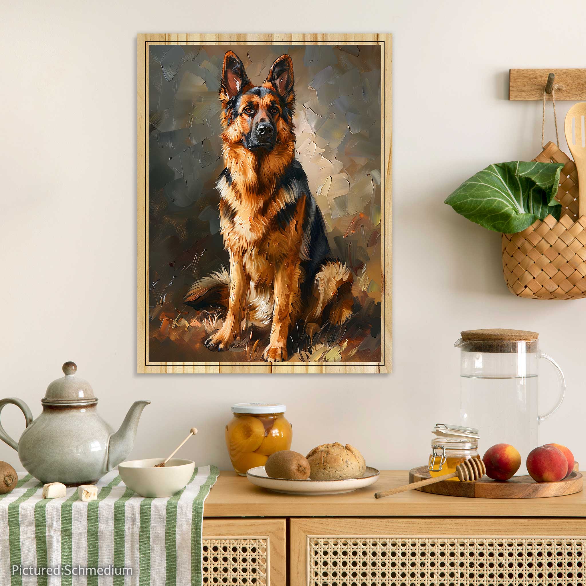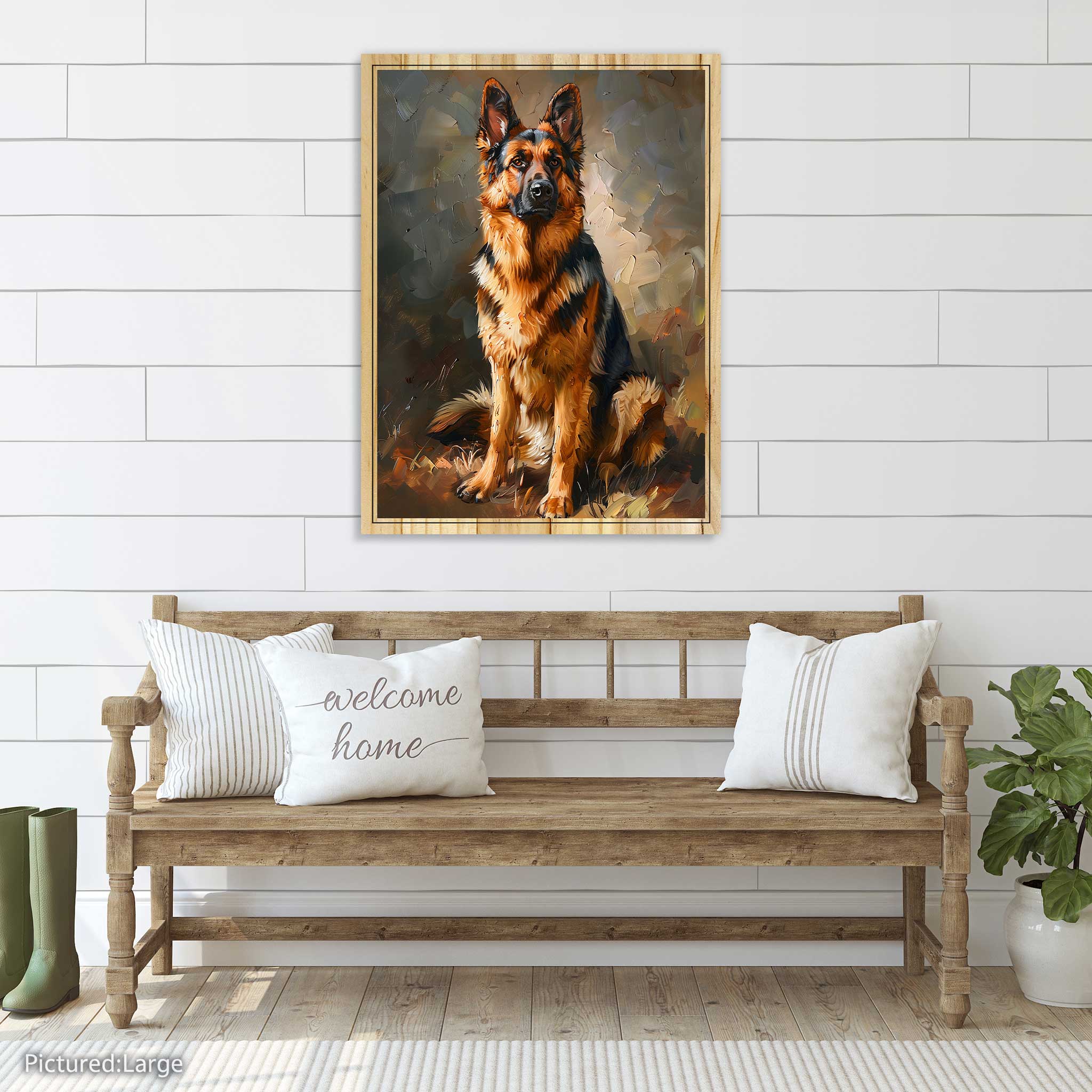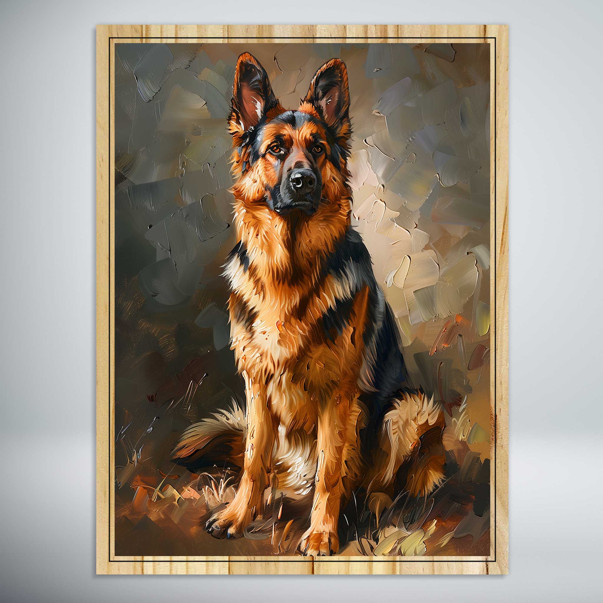 Our German Shepherd artwork brings that majestic presence and soulful depth to life on real, sustainable pine wood. The elevated ink technology creates raised layers of texture so you can feel the thick fur, the strong muzzle, those perky ears, and the subtle sheen in their watchful gaze—like you're reaching out to give them a reassuring pat. The natural wood grain adds incredible warmth, with unique tones, contrasts, and textures making every single piece one-of-a-kind—no two exactly the same.