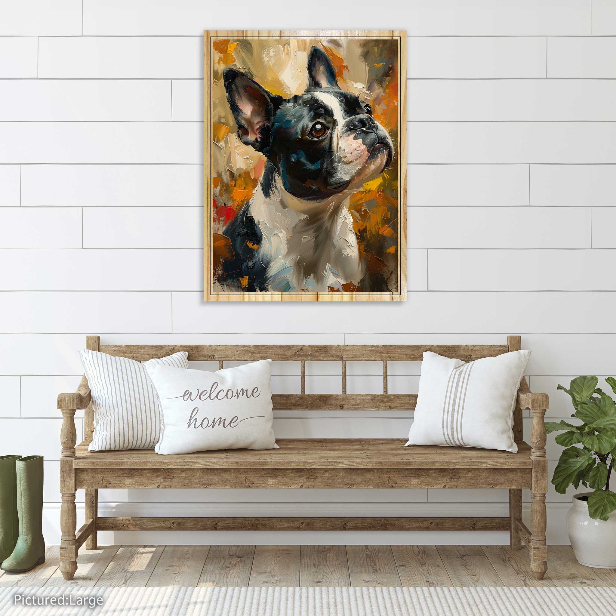 Our Boston Terrier artwork captures all that dapper charm and lively spirit on real, sustainable pine wood. The elevated ink technology builds up layers of texture so you can actually feel the smooth coat, those perky ears, the expressive snout, and the subtle shine in those soulful eyes—like a hand-painted portrait brought to life. The natural wood grain adds warmth and unique character, making every piece truly one-of-a-kind with its own tones, contrasts, and textures.