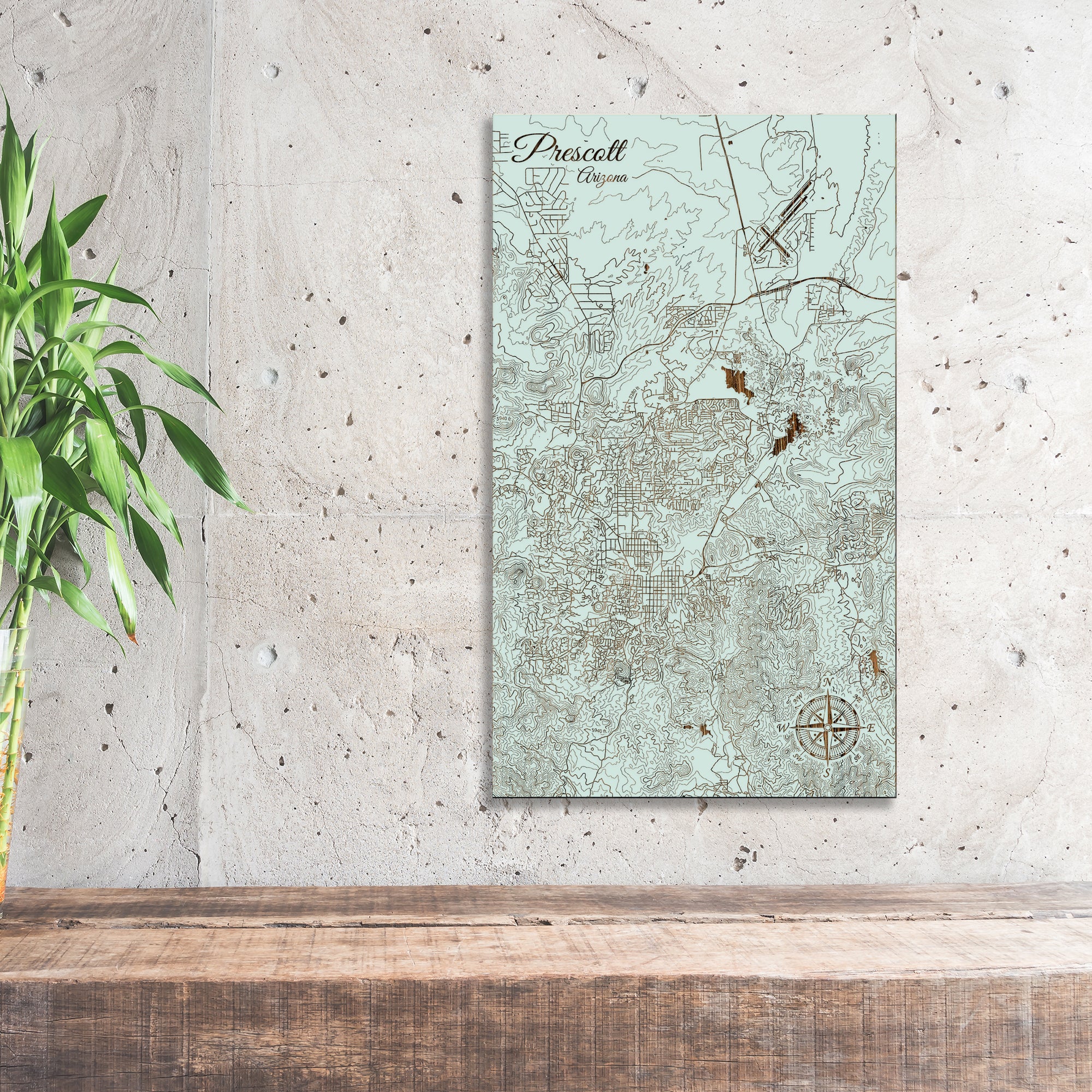 Exquisite Gift for Arizona Map Enthusiasts: Prescott, Arizona wood-engraved street map is a distinguished addition to any art collection. Crafted with precision from high-quality pine wood, this piece beautifully captures the detailed streets of Prescott, enhancing its visual appeal. It's perfect for those who appreciate the unique layouts of Arizona towns, geographical art, and the historic charm of Prescott.