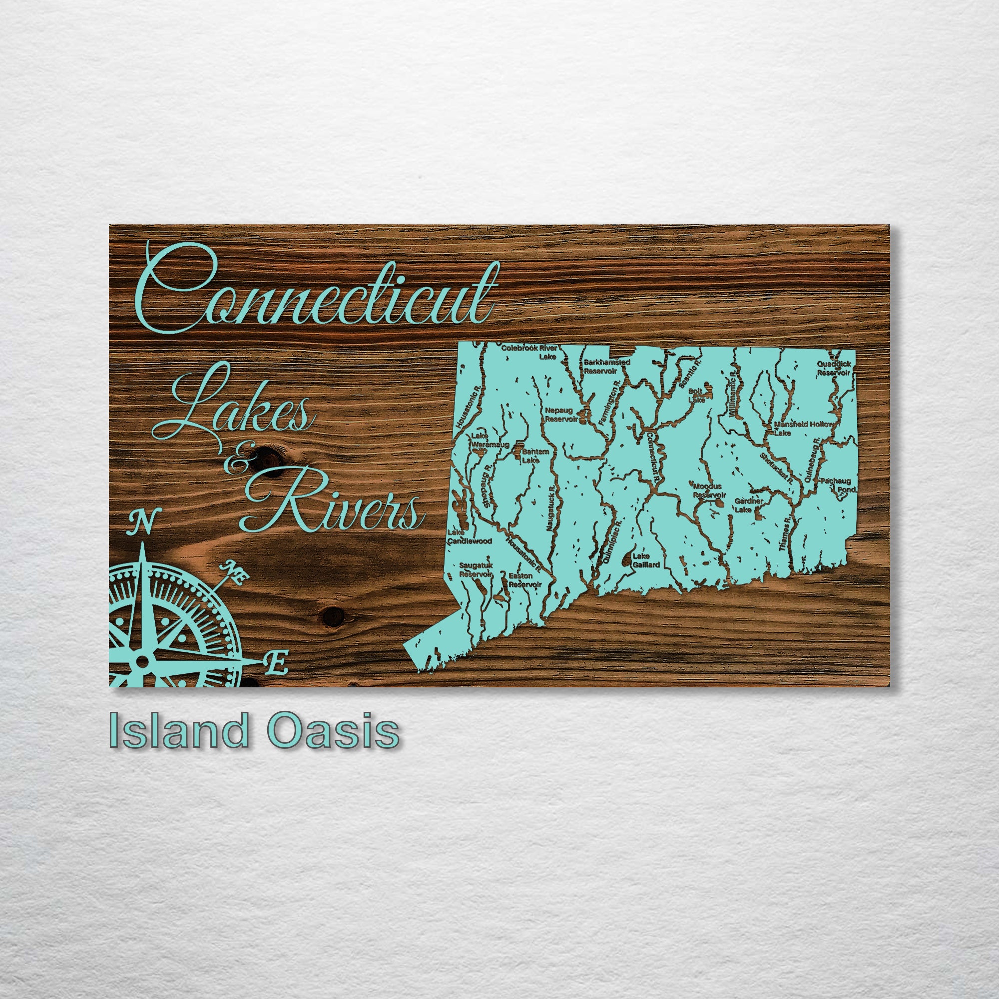 This is a map of the major lakes and rivers of Connecticut designed by Fire & Pine artists.
