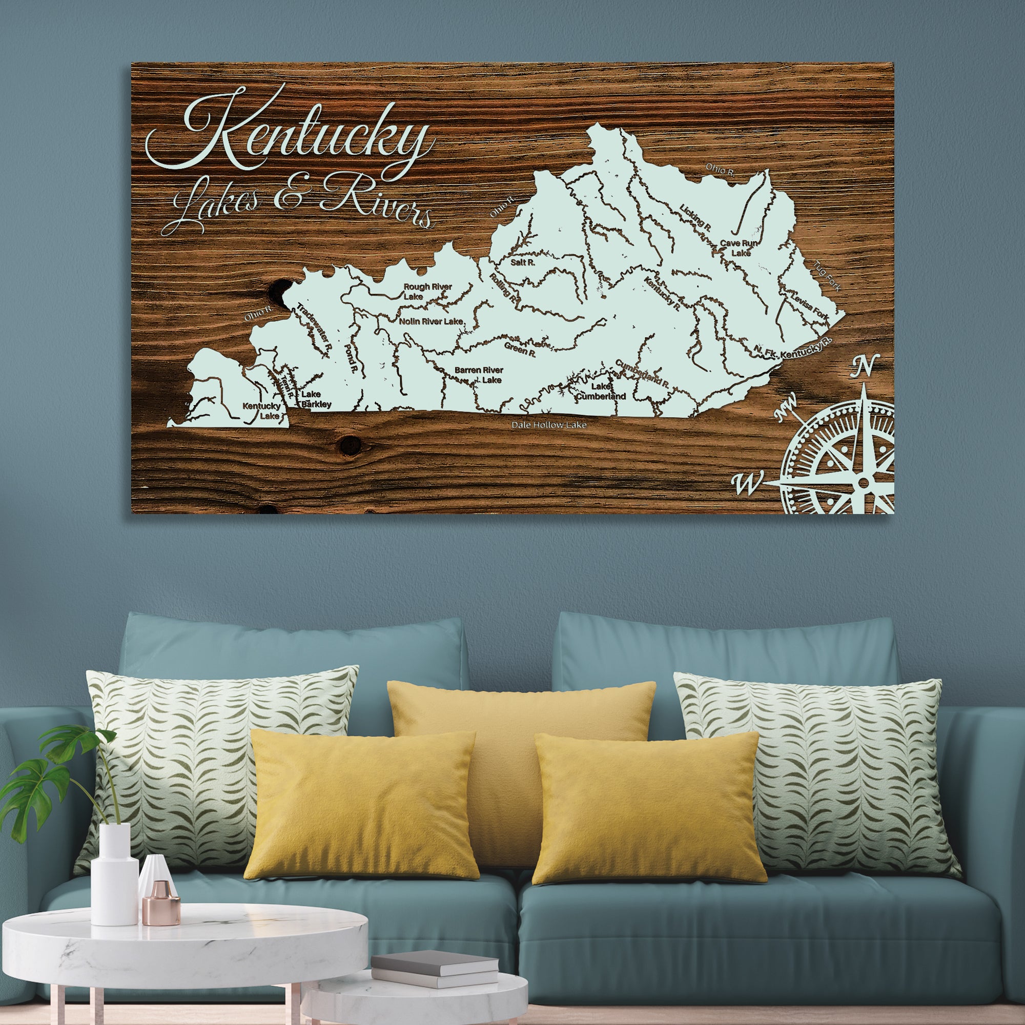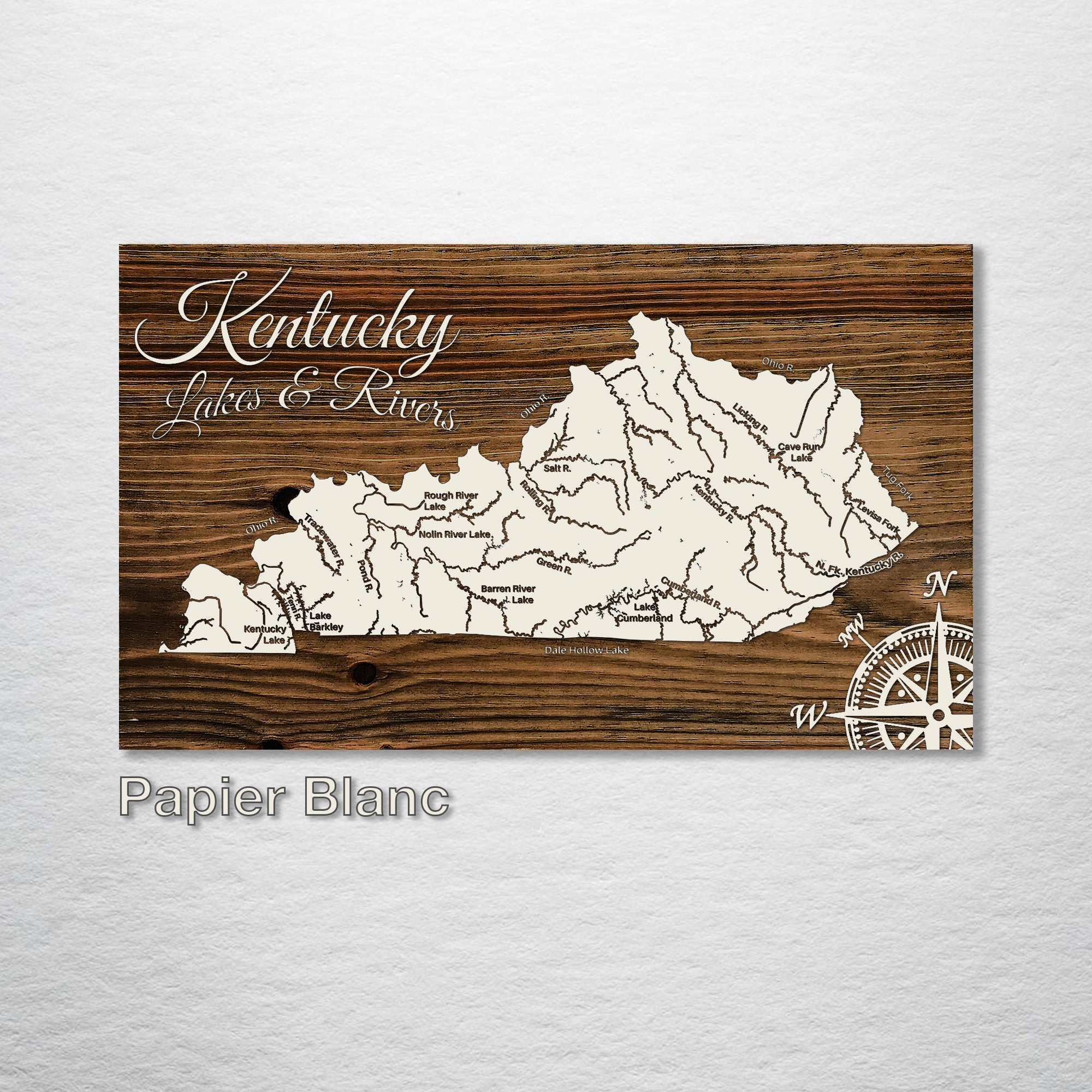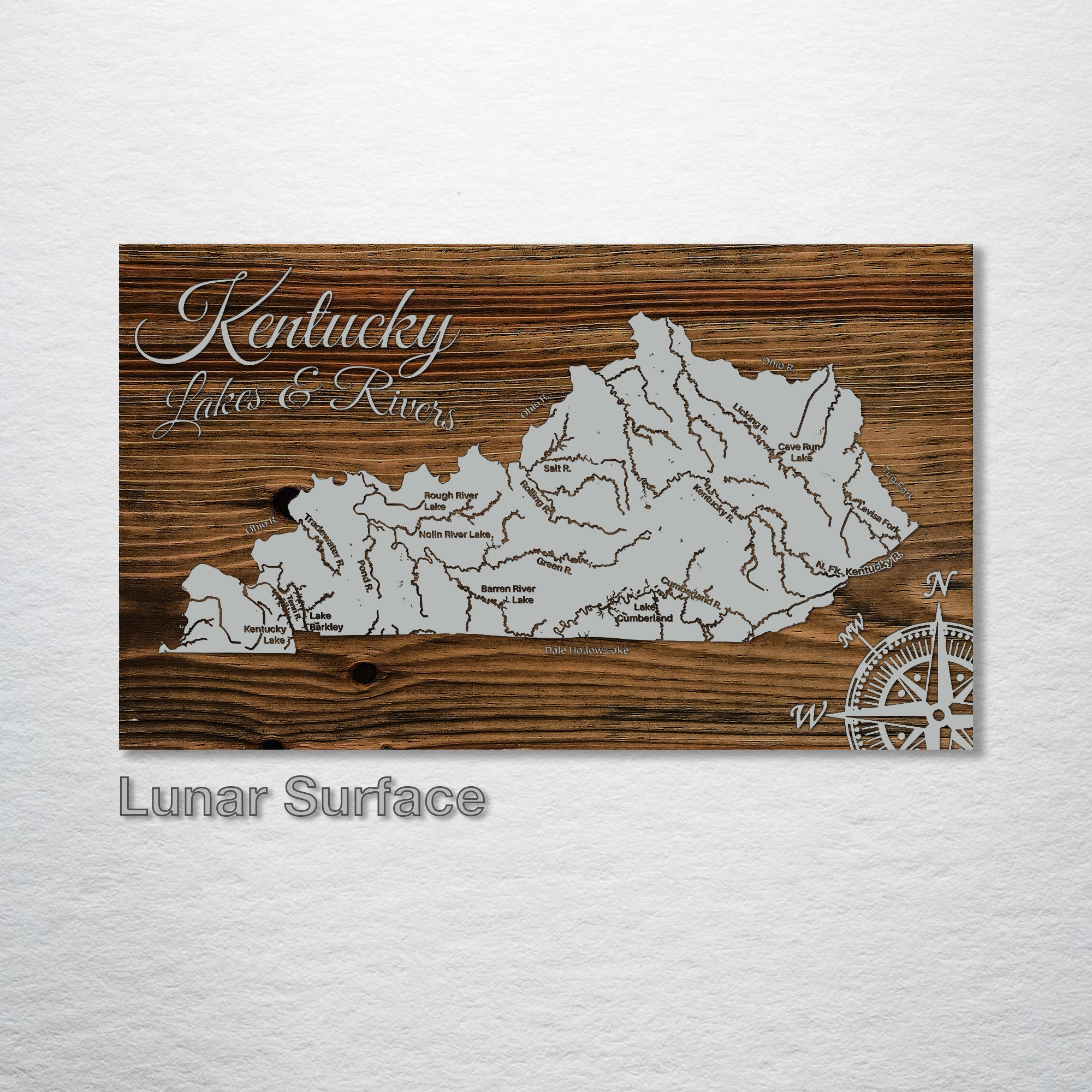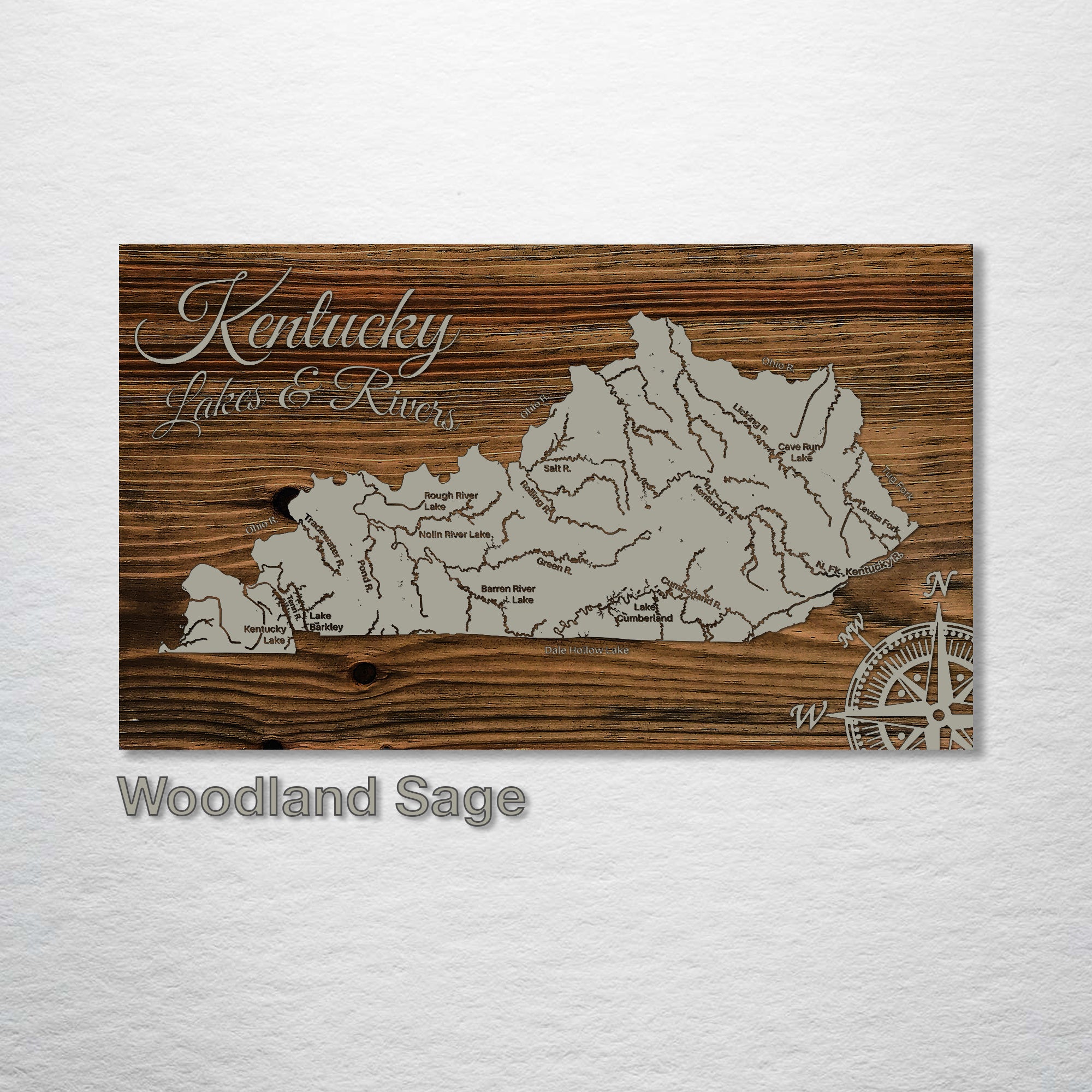 This is a map showing the major lakes and rivers of Kentucky designed by Fire & Pine artists.