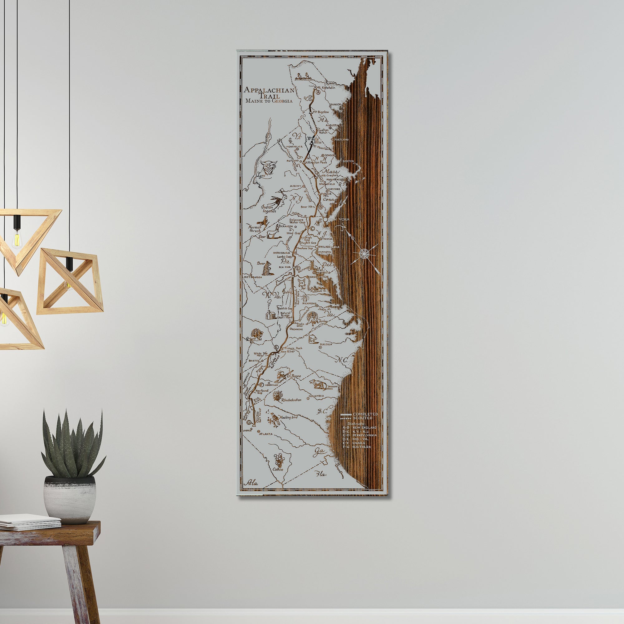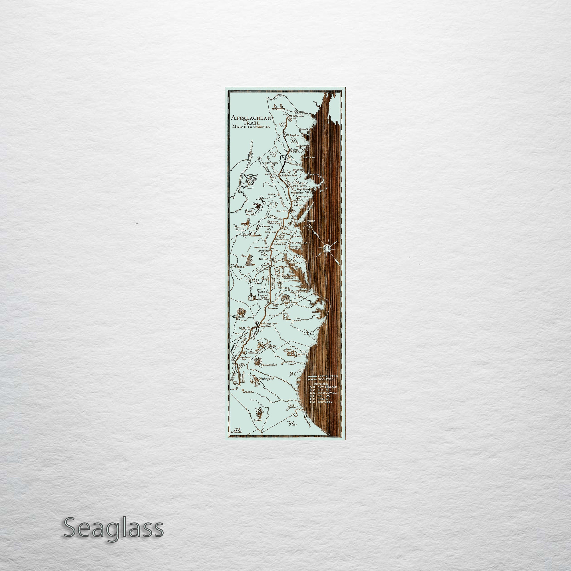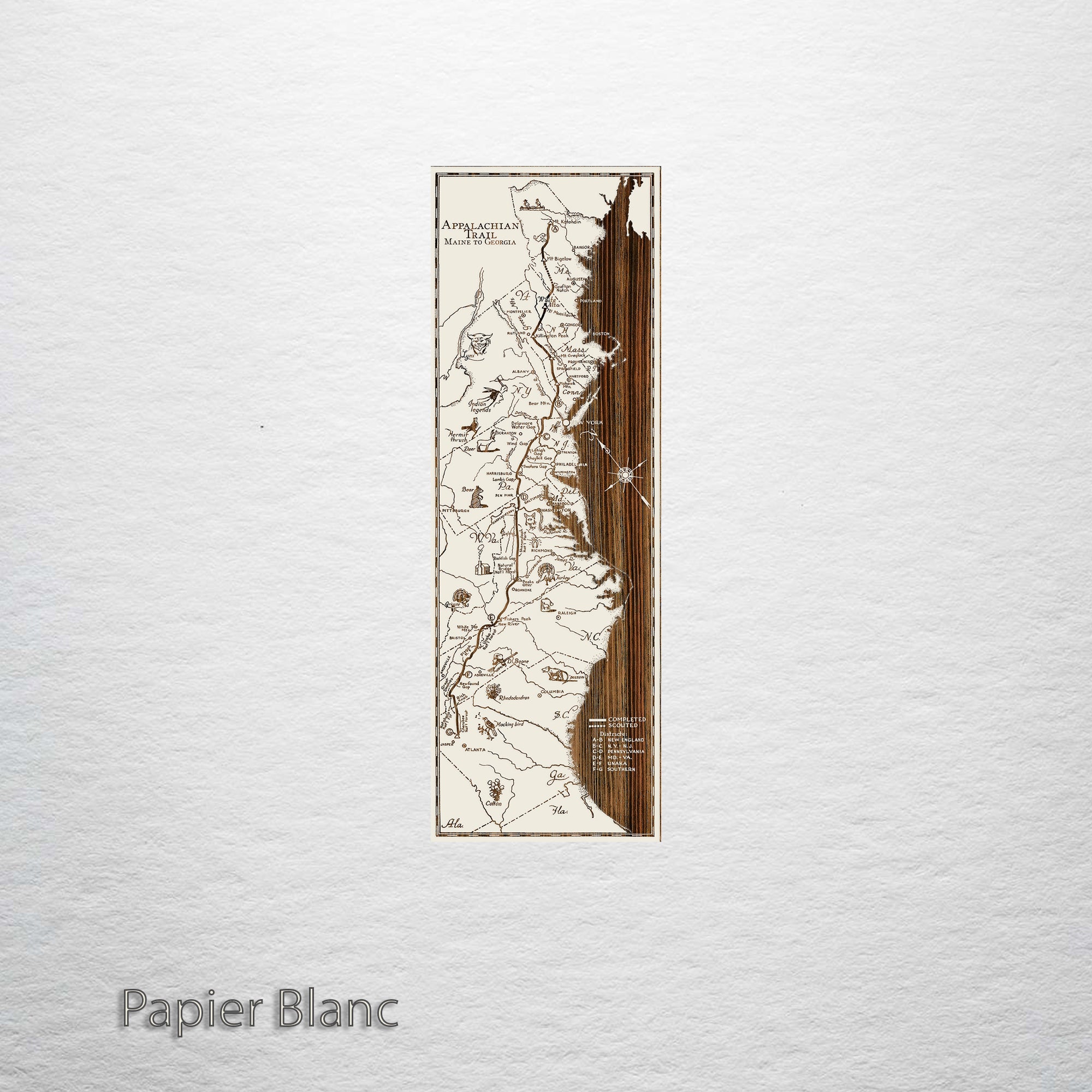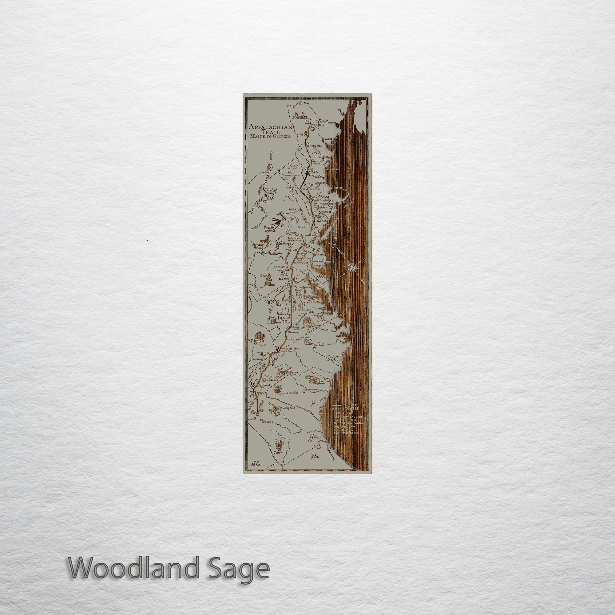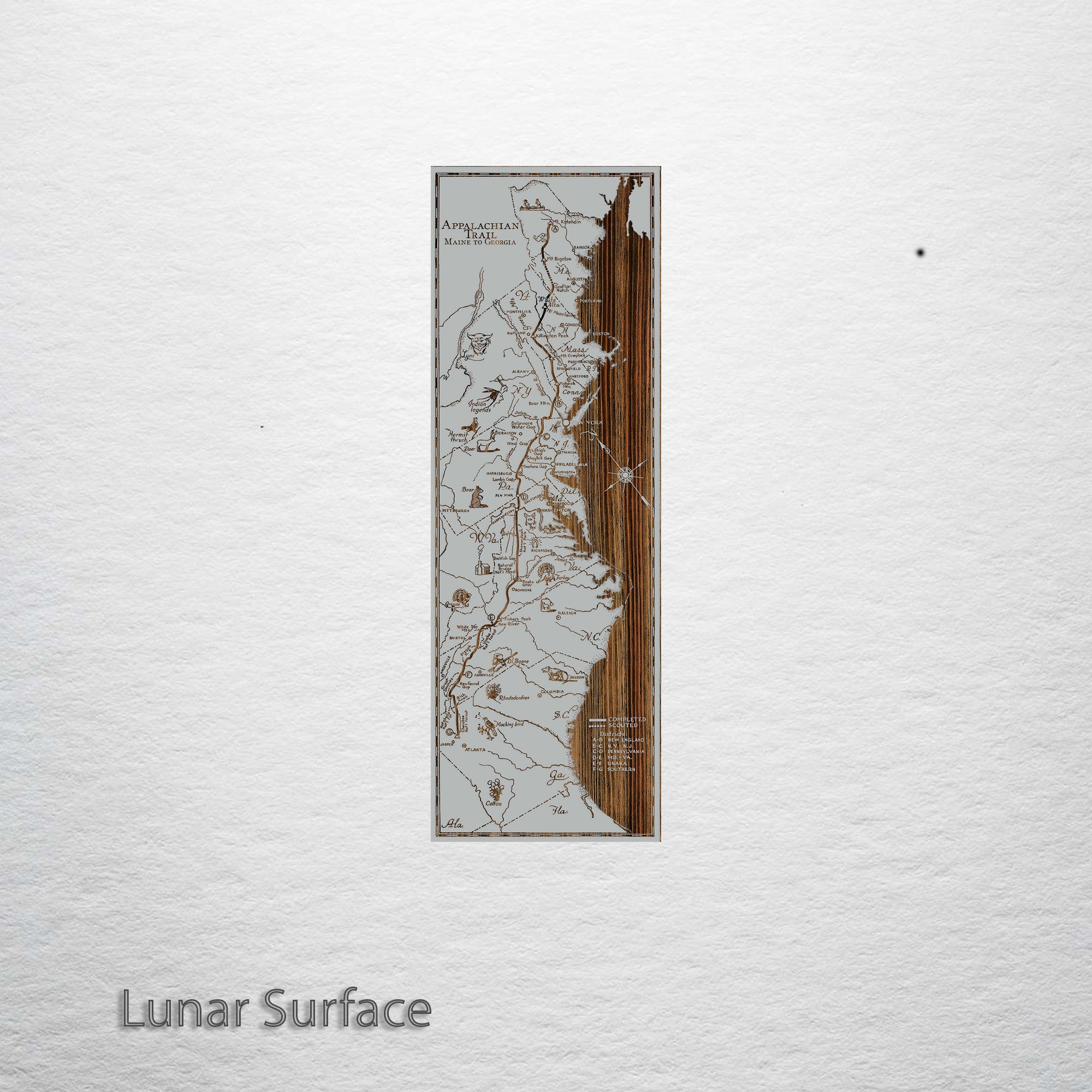 Spanning a total of 14 states, the Appalachian Trail extends north from Georgia covering nearly 2,200 miles of ground. If you are a step counter, you would log 5 million steps if you traveled this entire footpath, the longest of its kind in the United States. Our burnt wall map features not only the areas through which the trial winds, but also some critters you might see during your journey. We’ve even artfully carved the profile of Daniel Boone. In relief, he is unmistakable with  his trademark ‘coon skin hat.