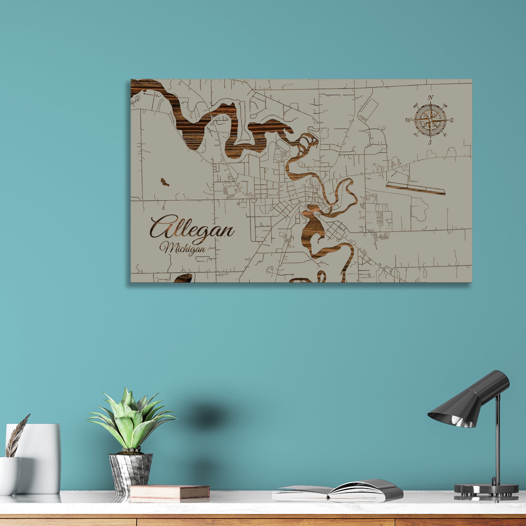 This is a street map of Allegan, MI designed by Fire & Pine artists.