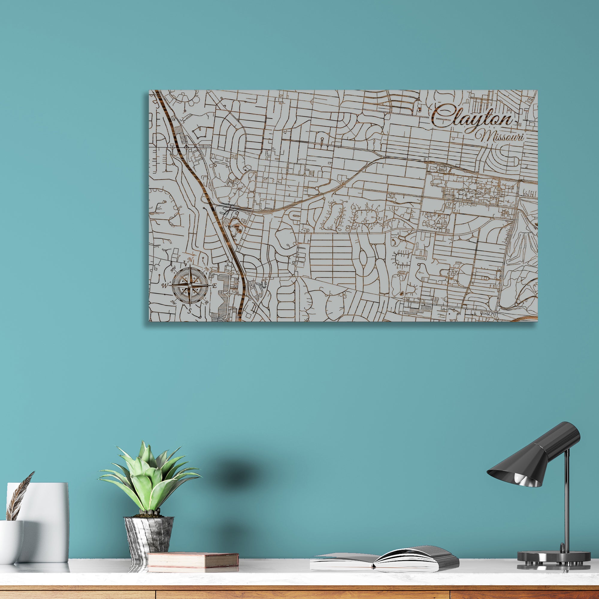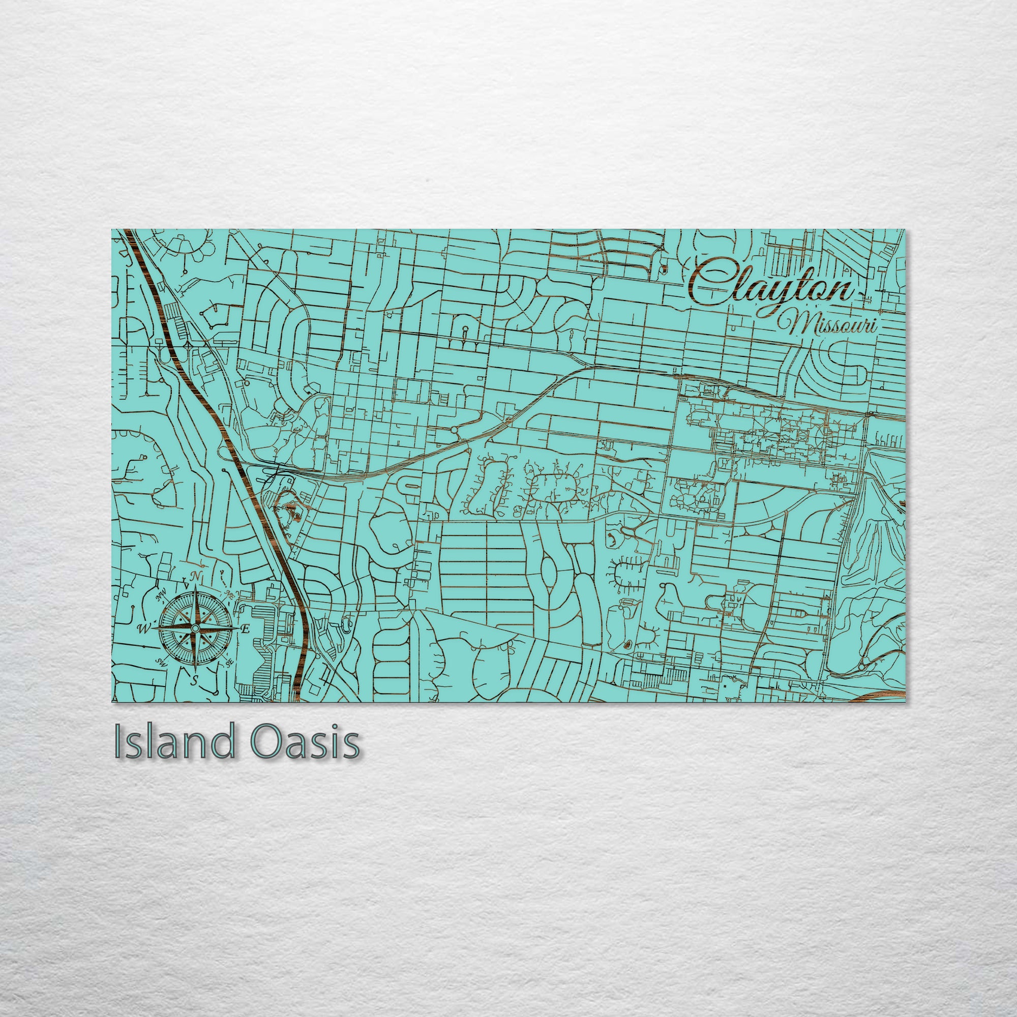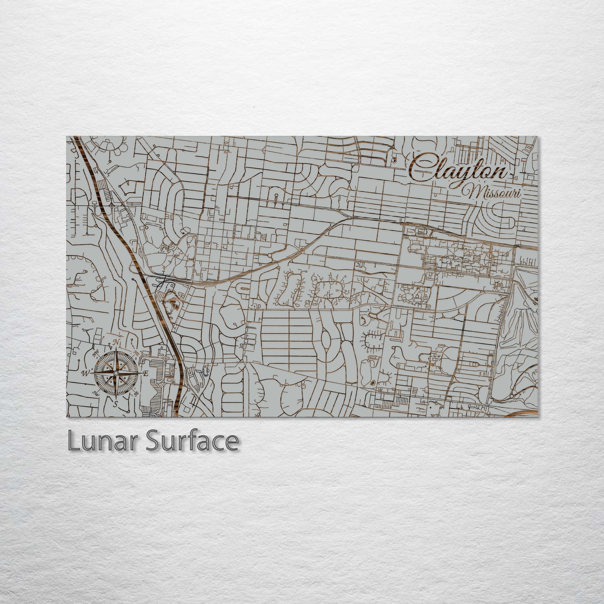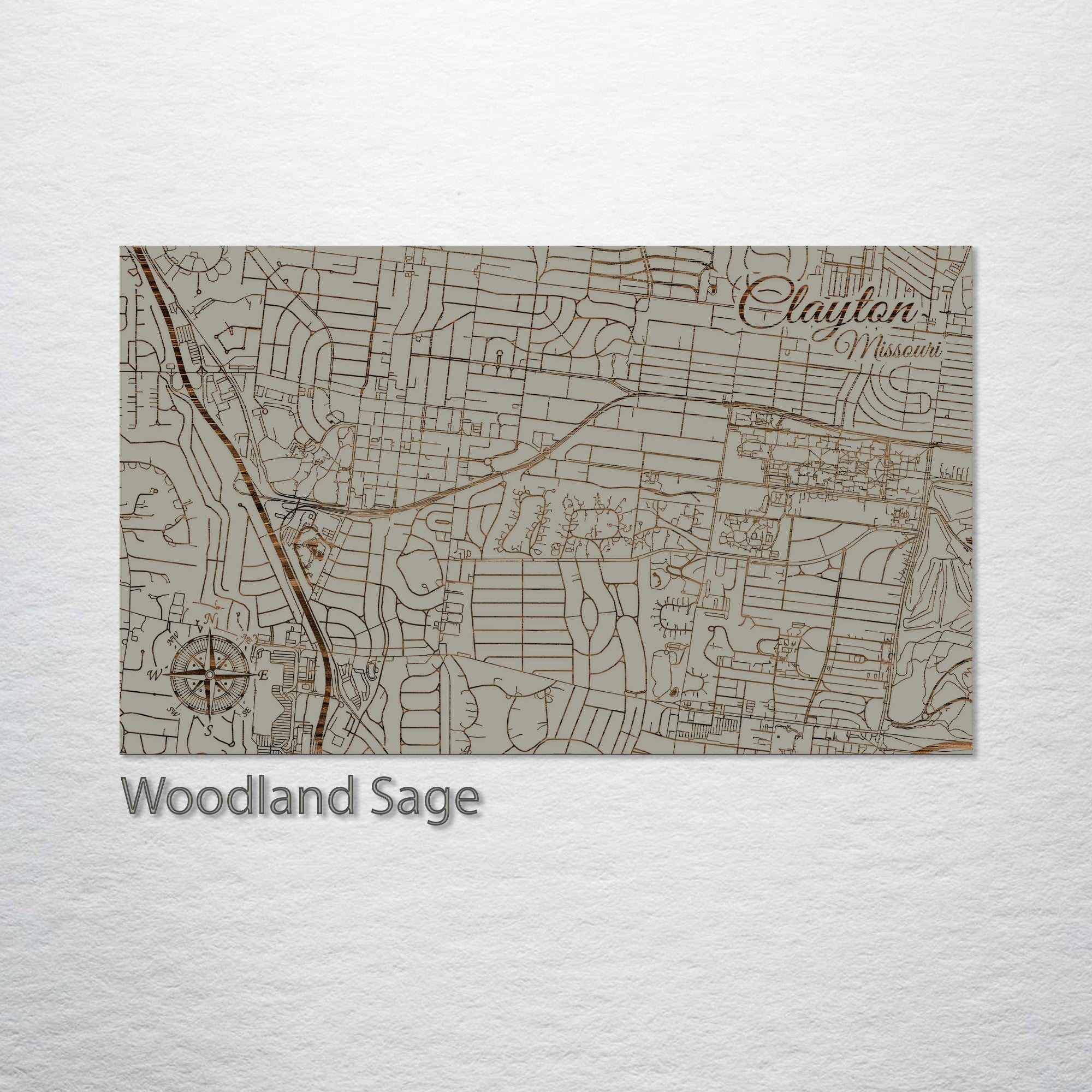 This is a street map of Clayton, MO designed by Fire & Pine artists.