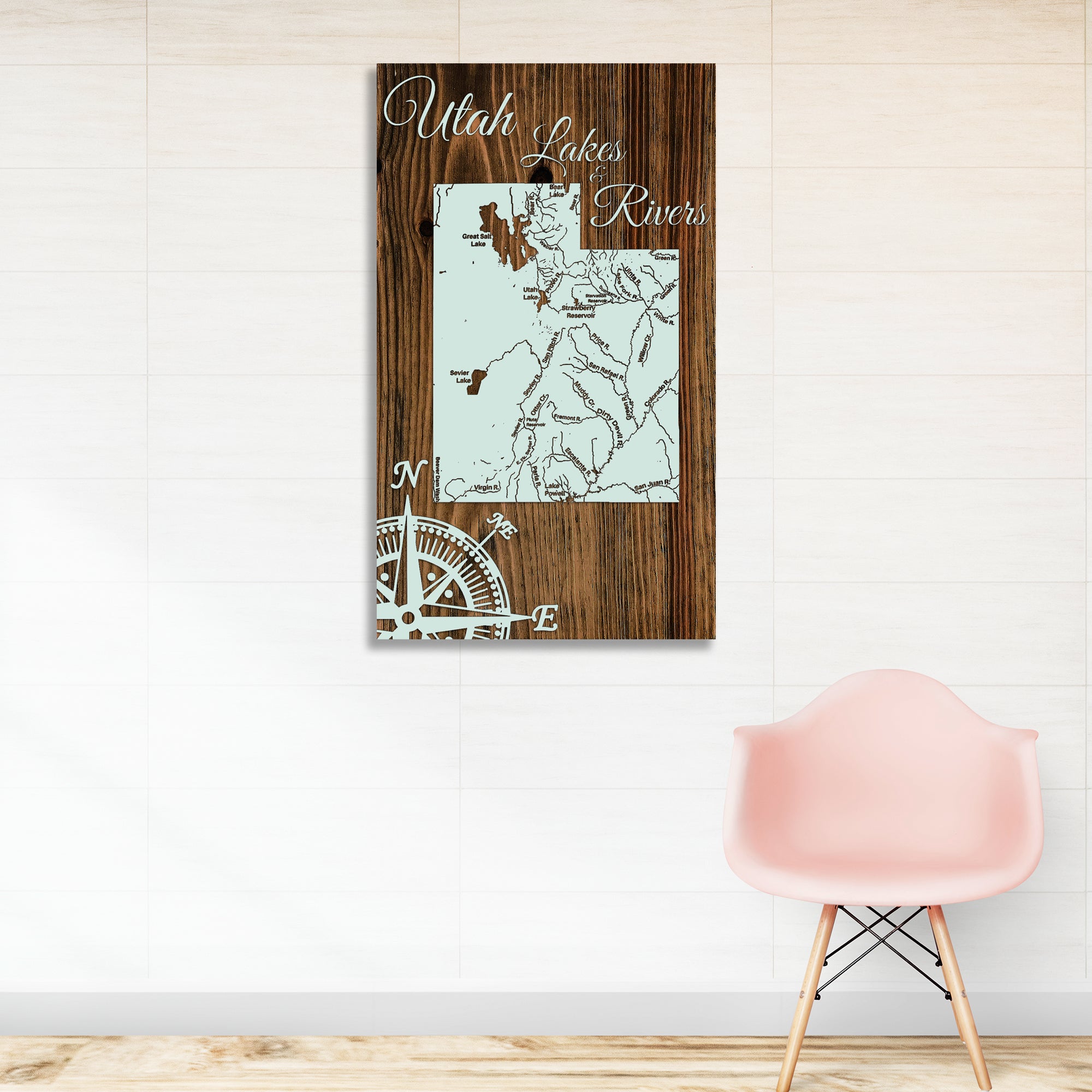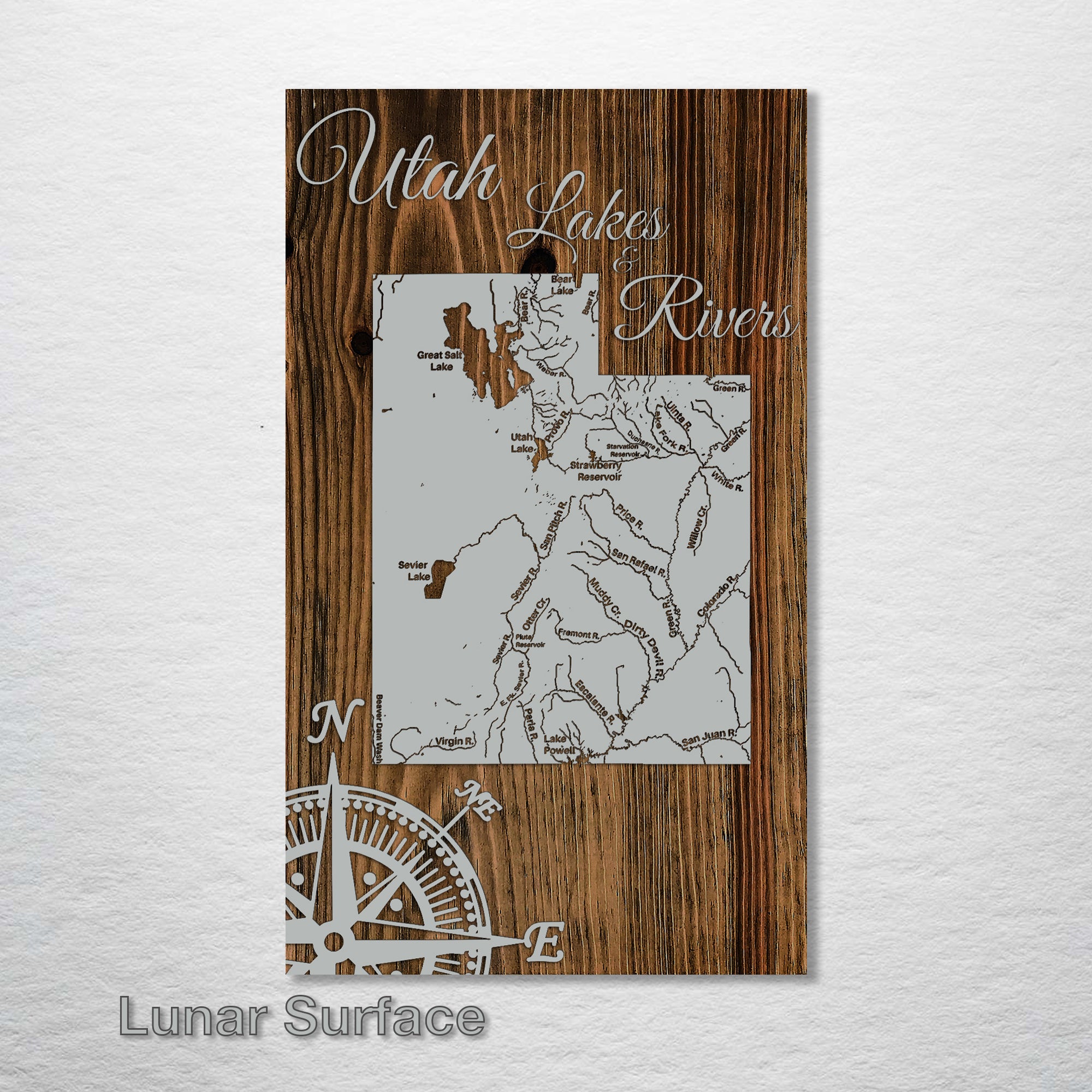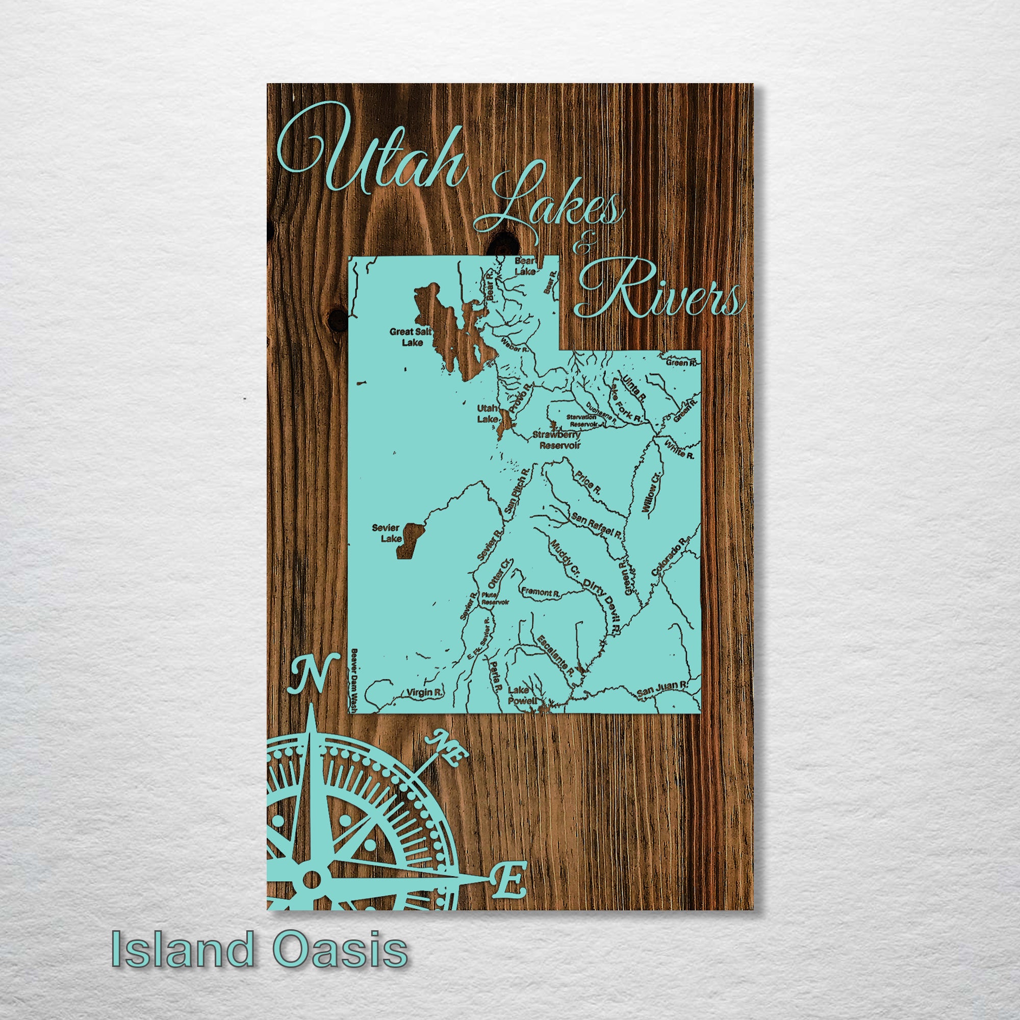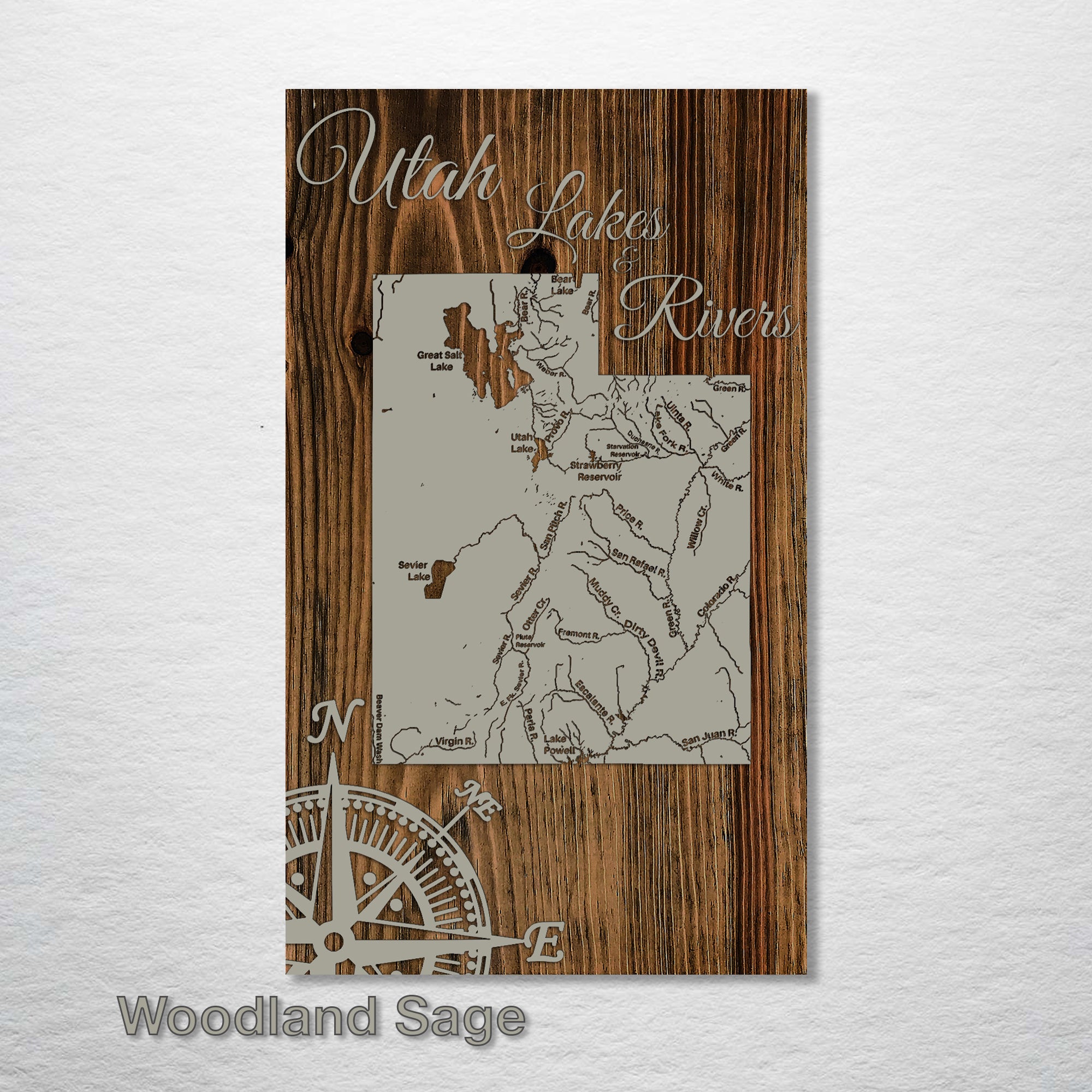 This is a map of the major lakes & rivers in Utah designed by Fire & Pine artists.