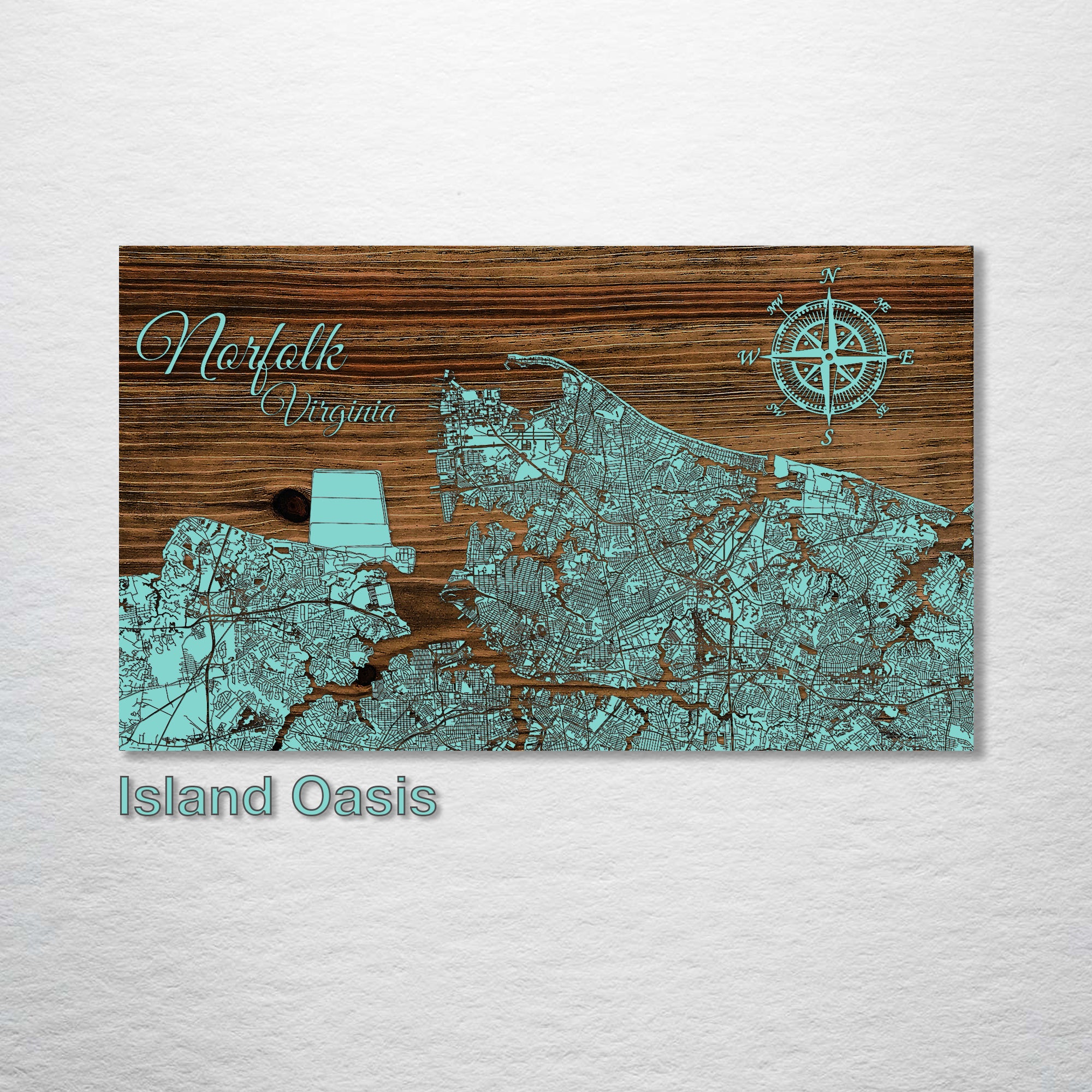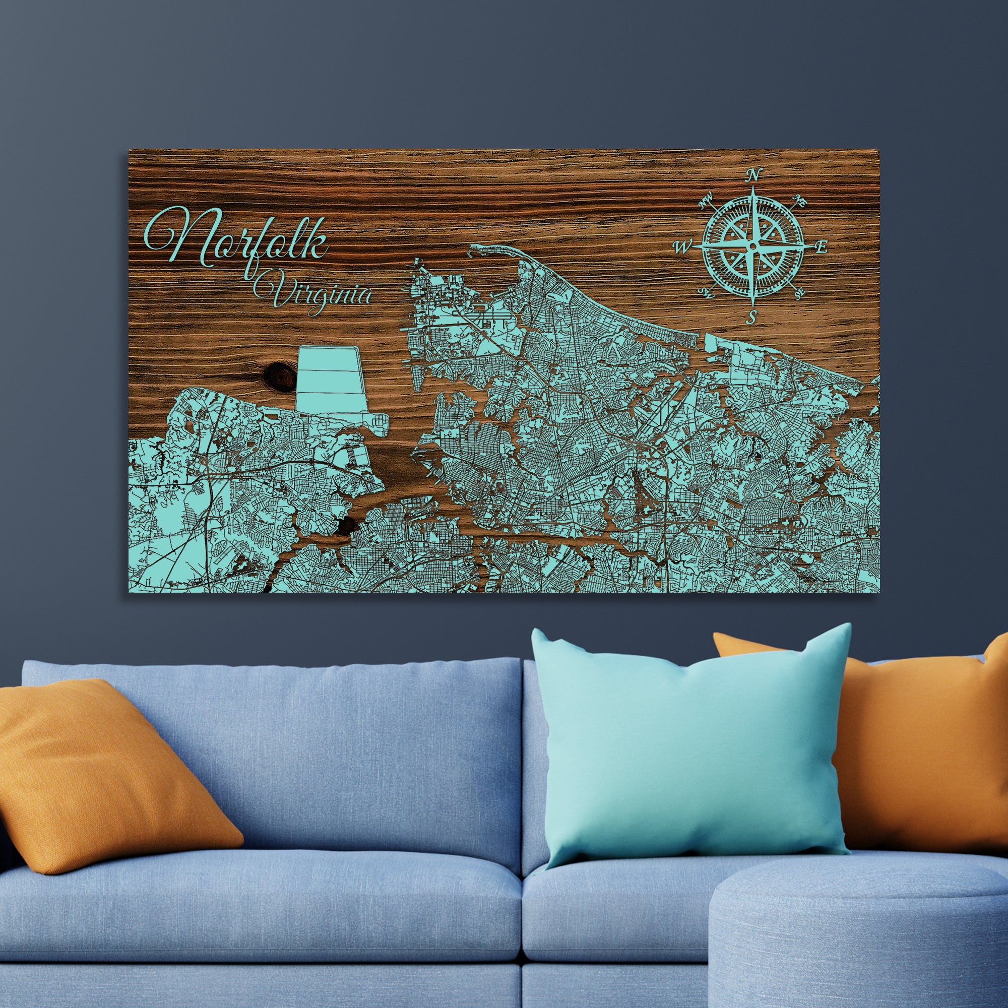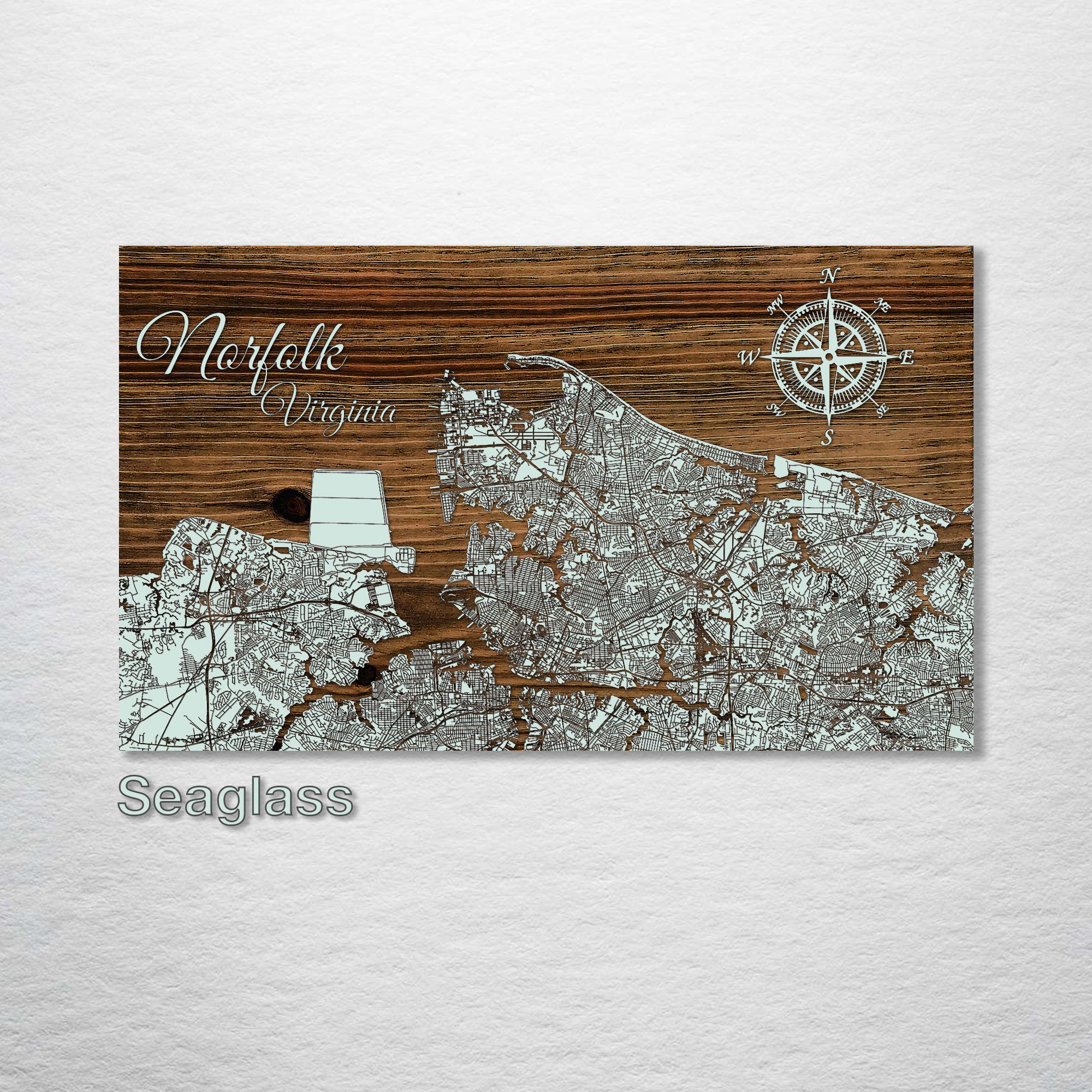 Unique gift for Norfolk enthusiasts: This Norfolk, Virginia street map is engraved into high-quality pine wood. The map's details are vivid, making it a noteworthy item for those interested in Norfolk or geographic art.